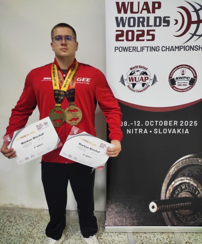 Von 08.10 bis 12.10 fand in Nitra (Slowakei) die diesjährige Weltmeisterschaft im Kraftdreikampf statt. Unter den gesamt über 350 Athleten aus mehreren Nationen, war der junge Pressbaumer BISCHOF Markus Teil der rot-weiß-roten Delegation.